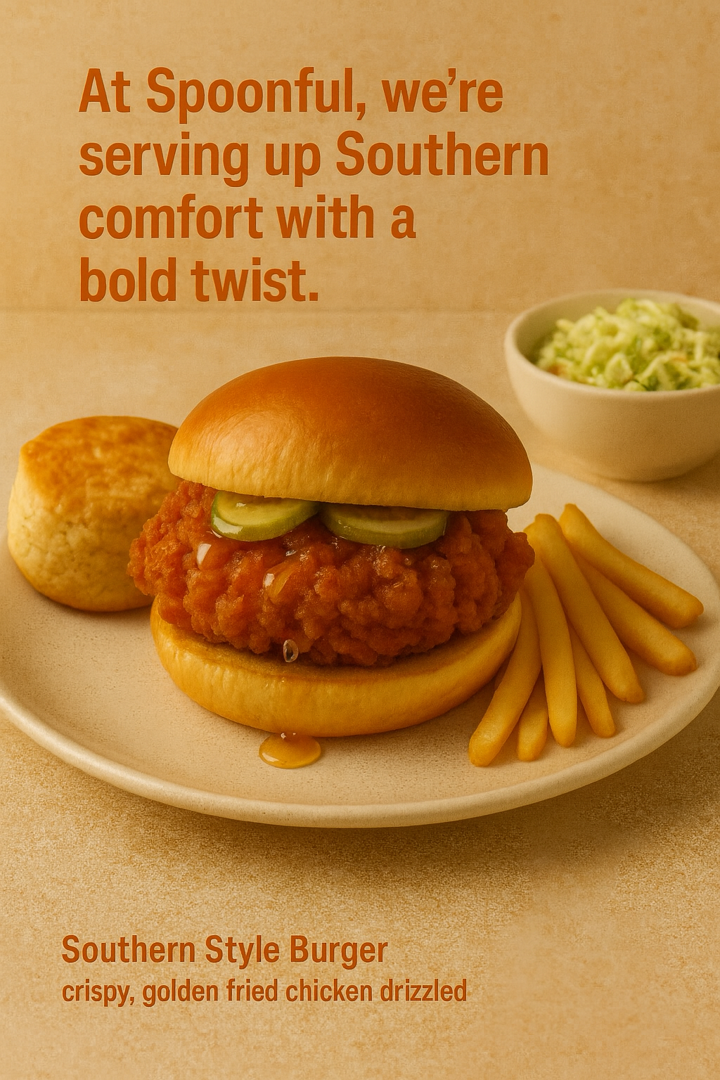 At Spoonful, we’re serving up Southern comfort with a bold twist. Our Southern Style Burger features crispy, golden fried chicken drizzled with sweet honey, tucked inside warm, buttery brioche bread or fluffy biscuits. Served with your choice of soulful sides, each plate is inspired by the rich traditions of Southern cooking—bringing you a perfect balance of crunchy, sweet, and savory. Whether you’re treating yourself or feeding the whole family, Spoonful delivers hearty, soulful flavor—one satisfying bite at a time.